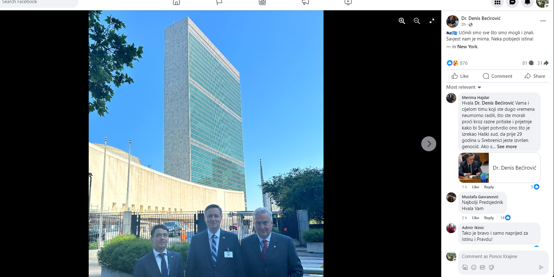 14:44 Predsjedavajući Predsjedništva BiH Denis Bećirović oglasio se iz Njujorka, gdje će uskoro početi sjednica Generalne skupštine UN-a na kojoj će se glasati o rezoluciji o genocidu u Srebrenici.