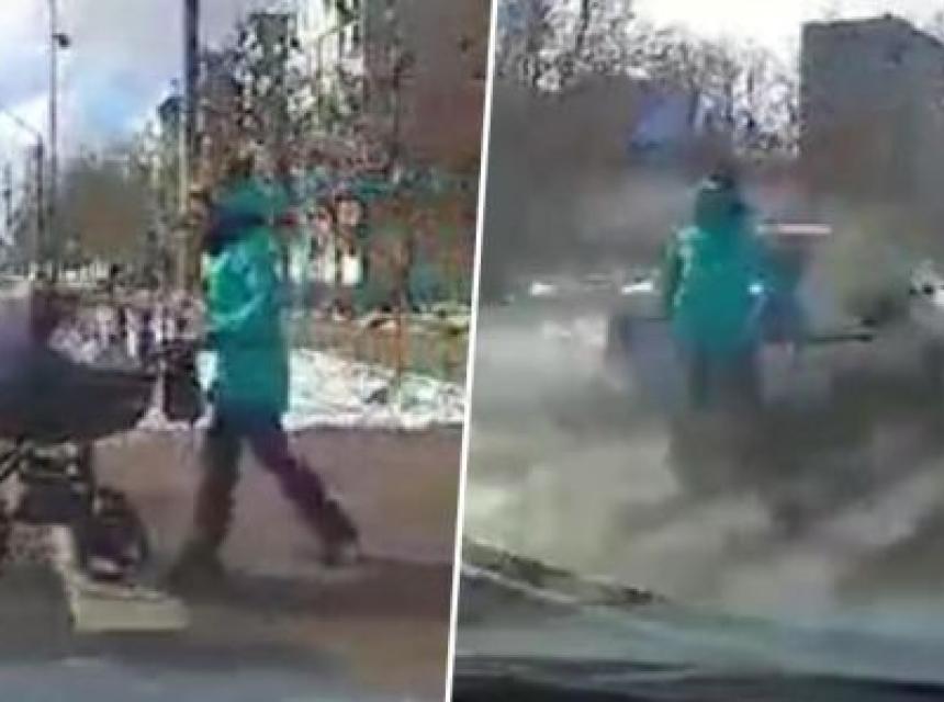 U trenutku udara mama je kolica gurala preko pješačkog prelaza, a dok je vozač jednog automobila stao kako bi ih propustio, drugi je naletio velikom brzinom i udario u njih. Kolica su odletjela u vazduh, iz njih su poispadale stvari, a žena, hvatajući se za glavu, potrčala je prema njima.