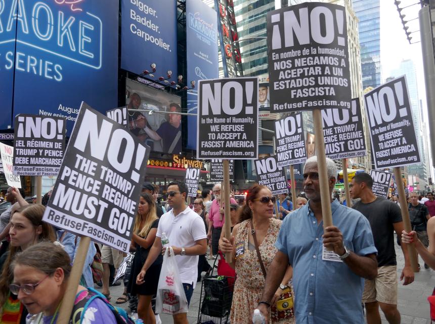 Protesti u New Yorku počeli su komemoracijom u Brooklynu, a potom su demonstranti sa trgu Times marširali do Trump Towera i uzvikivali slogane "Ne, KKK-u, ne fašizmu u Americi, ne Trumpu". Protesti u New Yorku održani su uz pojačane mjere sigurnosti, a policija je privela najmanje tri osobe zbog narušavanja javnog reda.