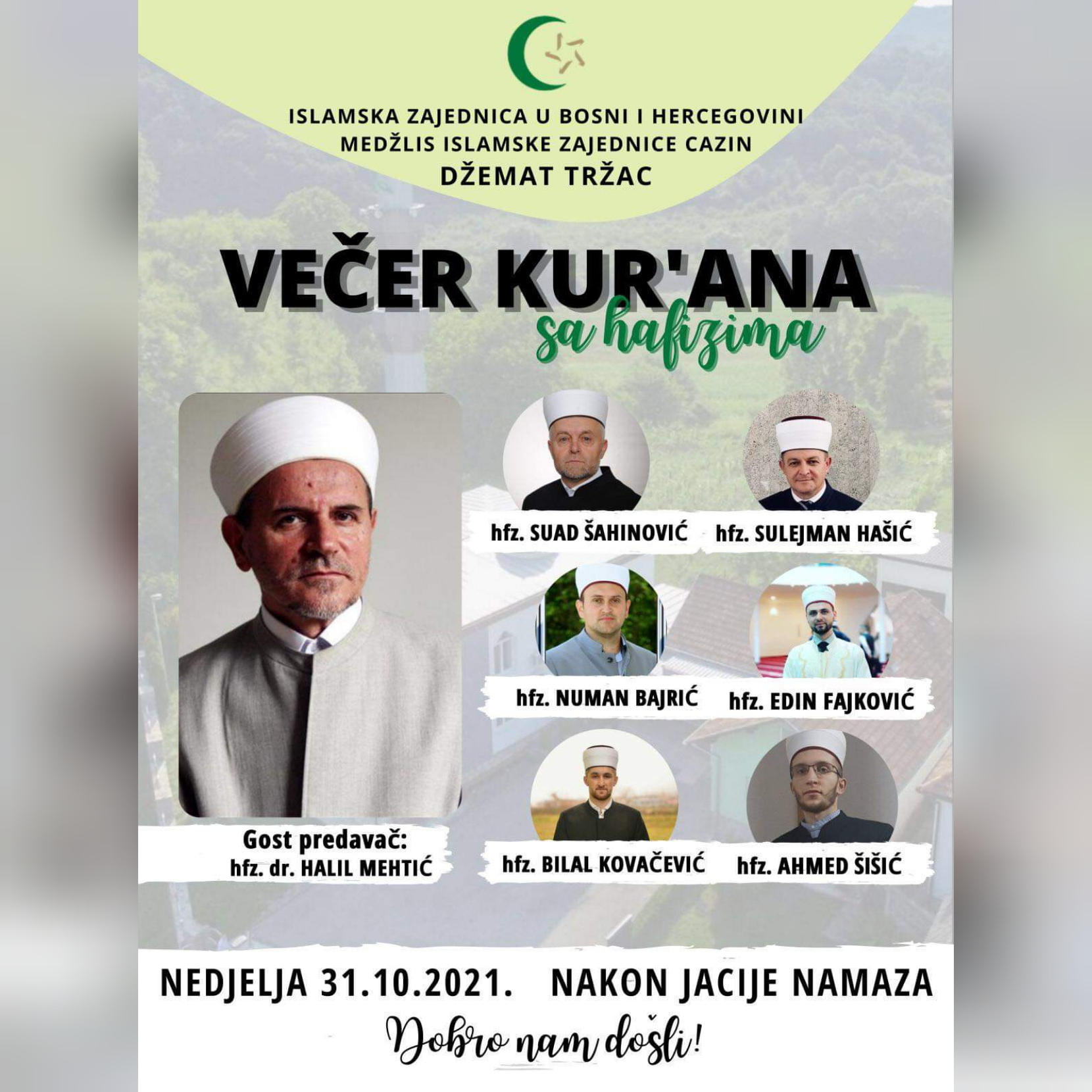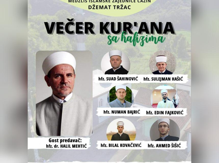 Islamska zajednica u Bosni i Hercegovini, Medžlis Islamske zajednice Cazin i Džemat Tržac, pozivaju Vas, da svojim prisustvom uveličate svečanost "Večer Kur'ana sa hafizima".