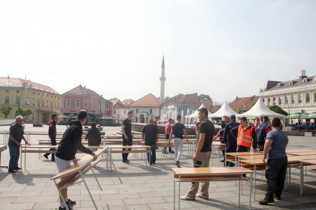 Trenutno se na Trgu slobode izvode pripreme za večerašnji iftar. Postavljaju se klupe i stolice, a akciju, osim radnika Islamske zajednice, pomažu i brojni volonteri.