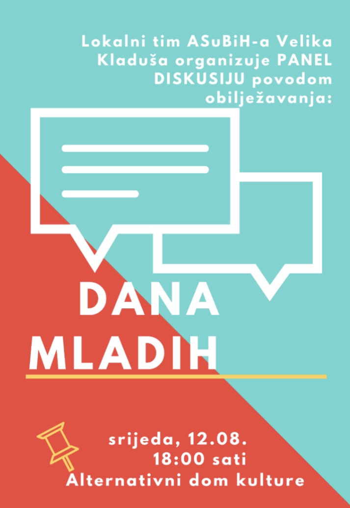 Asocijacija Srednjoškolaca u Bosni i Hercegovini (ASuBiH), tačnije lokalni tim Velika Kladuša poziva srednjoškolce i mlade ljude u Velikoj Kladuši da nam se pridruže u srijedu, 12.augusta, na PANEL DISKUSIJI povodom obilježavanja Dana mladih. Održat će se u prostorijama Alternativnog doma kulture, sa početkom u 18:00 sati.
