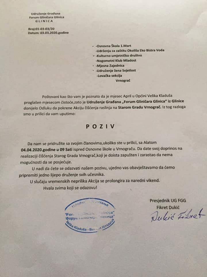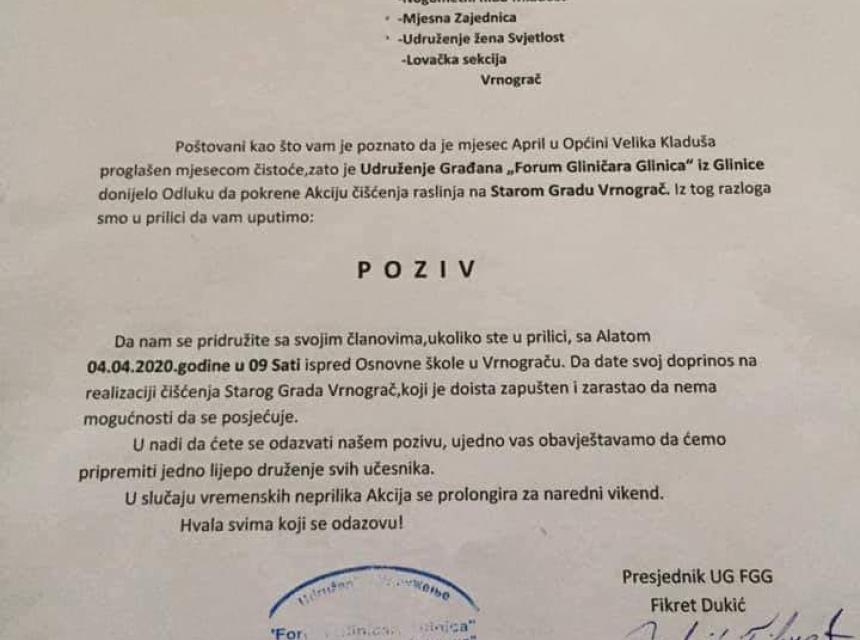 Nakon 8.godina pokrenuta Akcija za čišćenje Starog grada Vrnograč Udruženje Forum Gliničara Glinica pozvalo je sva udruženja sa područja Vrnograča i mjesnu zajednicu te školu na Akciju.
