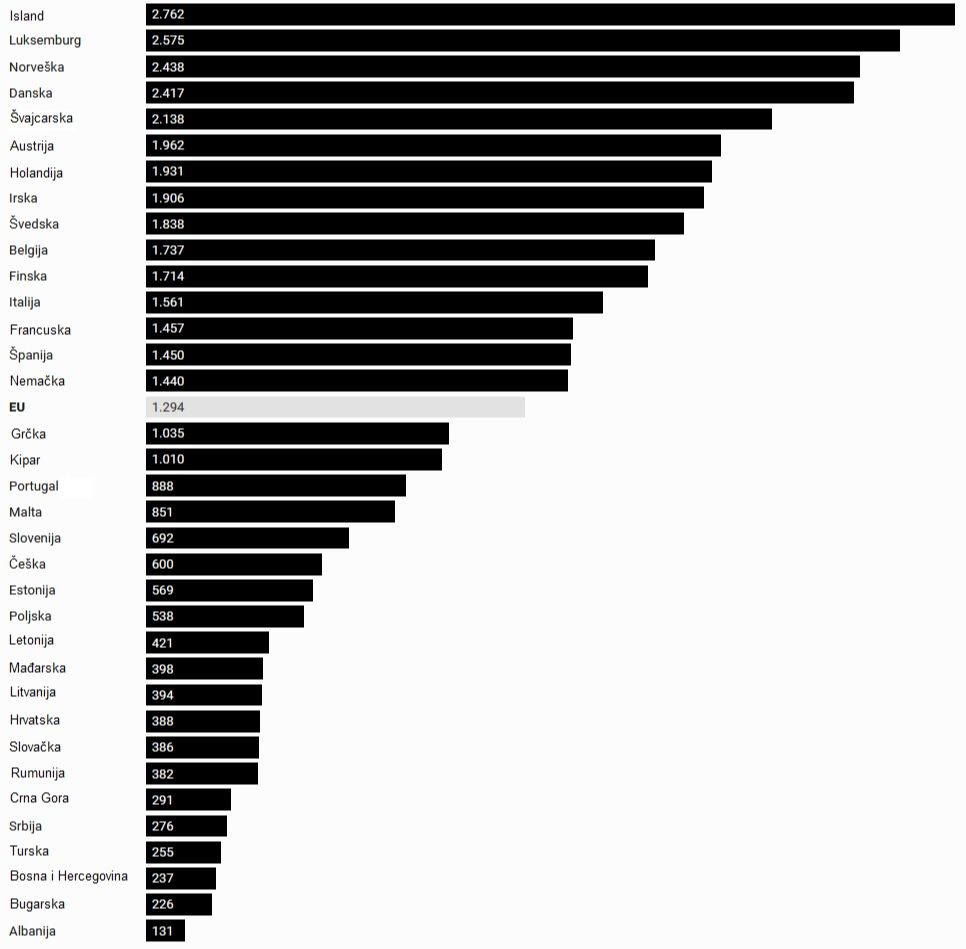 Iako je riječ o podacima za 2021. oni su dovoljno indikativni da pokažu razlike među zemljama.