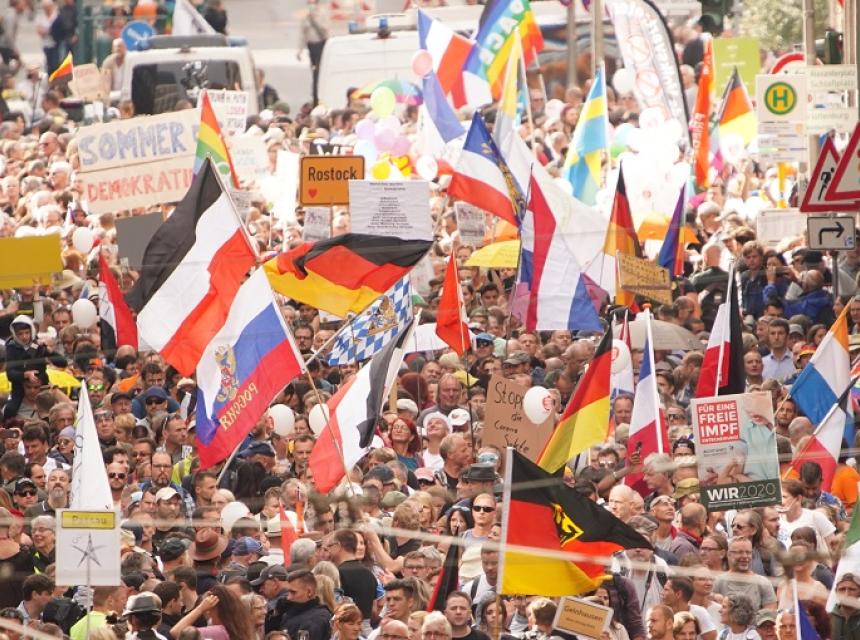 Skup pod nazivom "Svečanost slobode i mira", koji okuplja različite elemente društva, bio je drugi skup u mjesec dana, što zabrinjava vlasti. Skup je bio jako mješovit, svih dobnih skupina, uključujući obitelji s jako malom djecom. Bilo je zastava duginih boja uz one njemačke, a prosvjednici su više puta izvikivali: "Merkel mora otići."