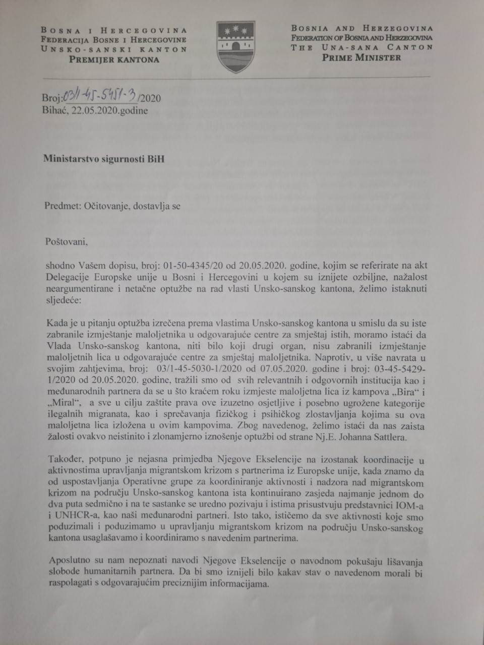 U pismu se navodi da Vlada USK niti bilo koji organ tog katona nije zabranio izmiještanje maloljetnih osoba u odgovarajuće centre, te da je USK učinio sve da se maloljetnici zaštite - budući da su posebno osjetljiva kategorija.