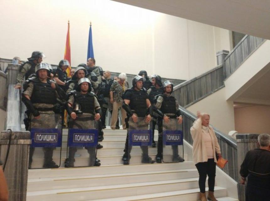 Policija je sinoć ispraznila zgradu Sobranja Makedonije od pristalica VMRO DPMNE koji su u nju upali oko 19.00, nakon što je parlamentarna većina samoincijativno izabrala poslanika DUI Talata Džaferija za predsjednika parlamenta.