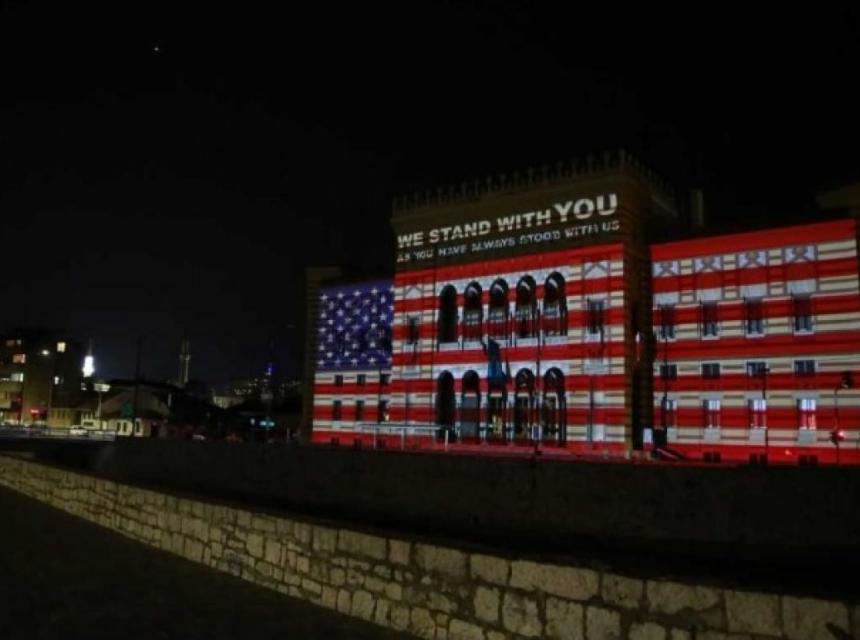 Sarajevska Vijećnica večeras je osvijetljena u bojama američke zastave sa porukom solidarnosti i podrške u ovim izazovnim vremenima.