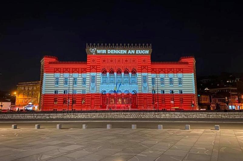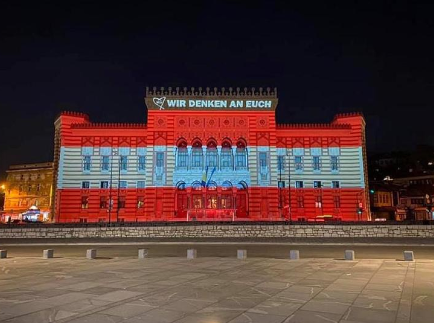Sarajevska Vijećnica, simbol glavnog grada Bosne i Hercegovine, večeras je osvijetljena u bojama zastave Republike Austrije u znak podrške građanima Beča nakon terorističkog napada.