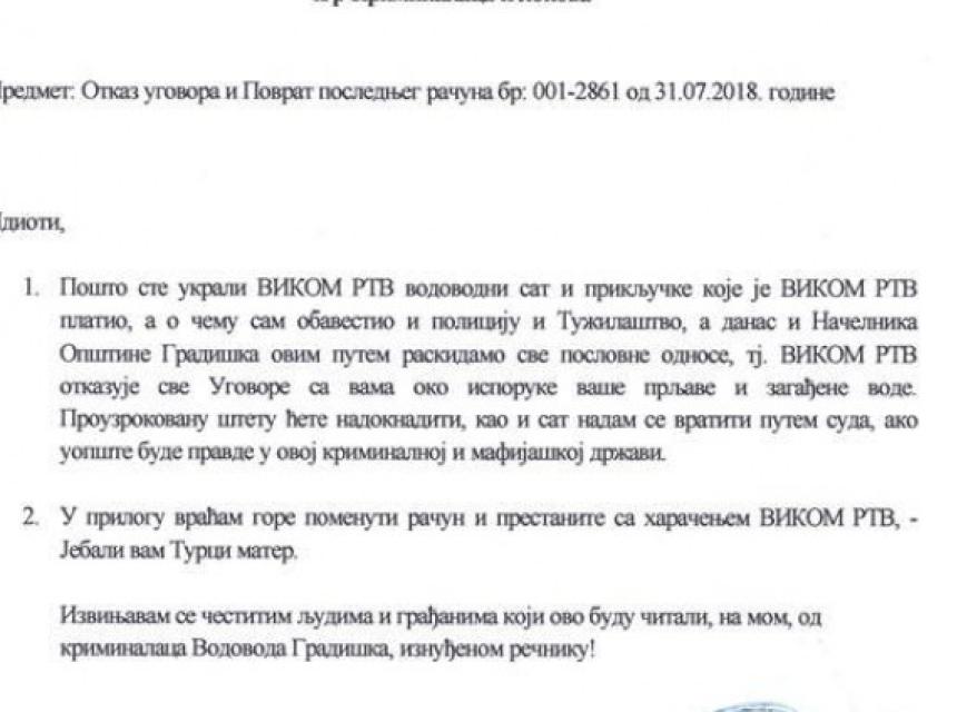 Pismo je naslovljeno na gradiški Vodovod, a Perić ga je objavio i na svom FB profilu.