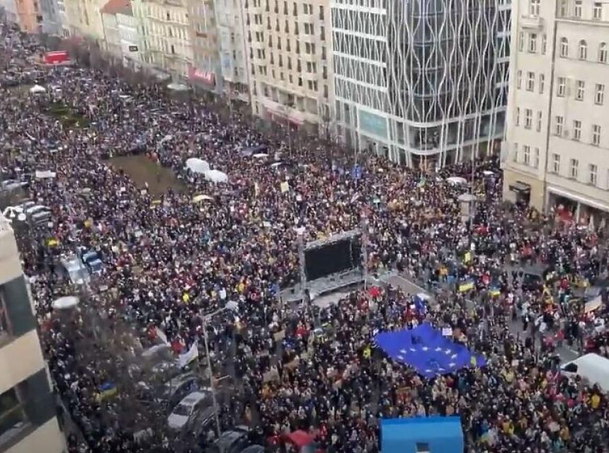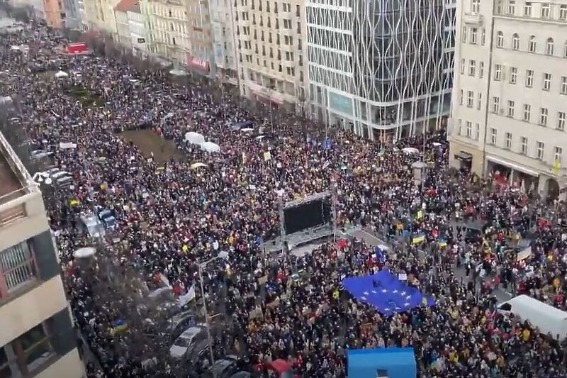 Demonstranti su ispunili 750 metara dug Vaclavski trg, mjesto najvećih demonstracija u historiji zemlje, skandirajući i mašući plavo-žutim ukrajinskim zastavama i natpisima s porukama poput "Ruke dalje od Ukrajine" i "Putin je ratni zločinac".