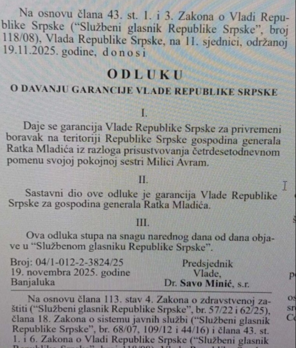 Na 11. sjednici Vlade Republike Srpske, održanoj 19. novembra, donijeta je odluka da se daju garancije osuđenom ratnom zločincu Ratku Mladiću za privremeni boravak na teritoriji Bosne i Hercegovine.