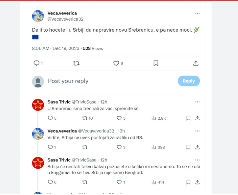 "Da li to hoćete i u Srbiji da napracite novu Srebrenicu, e pa neće moći", stoji u komentaru.