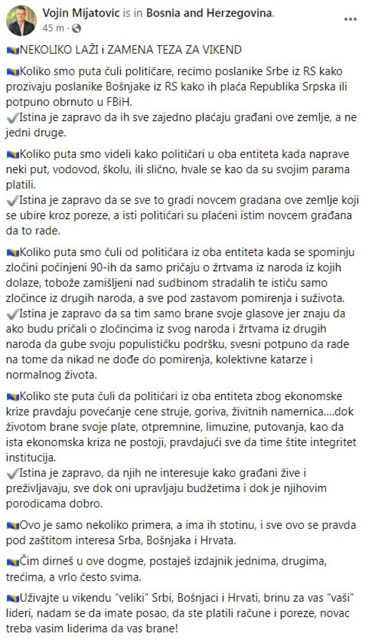 - Čim dirneš u ove dogme, postaješ izdajnik jednima, drugima, trećima, a vrlo često svima. Uživajte u vikendu “veliki” Srbi, Bošnjaci i Hrvati, brinu za vas “vaši” lideri, nadam se da imate posao, da ste platili račune i poreze, novac treba vasim liderima da vas brane - poručio je Vojin Mijatović.
