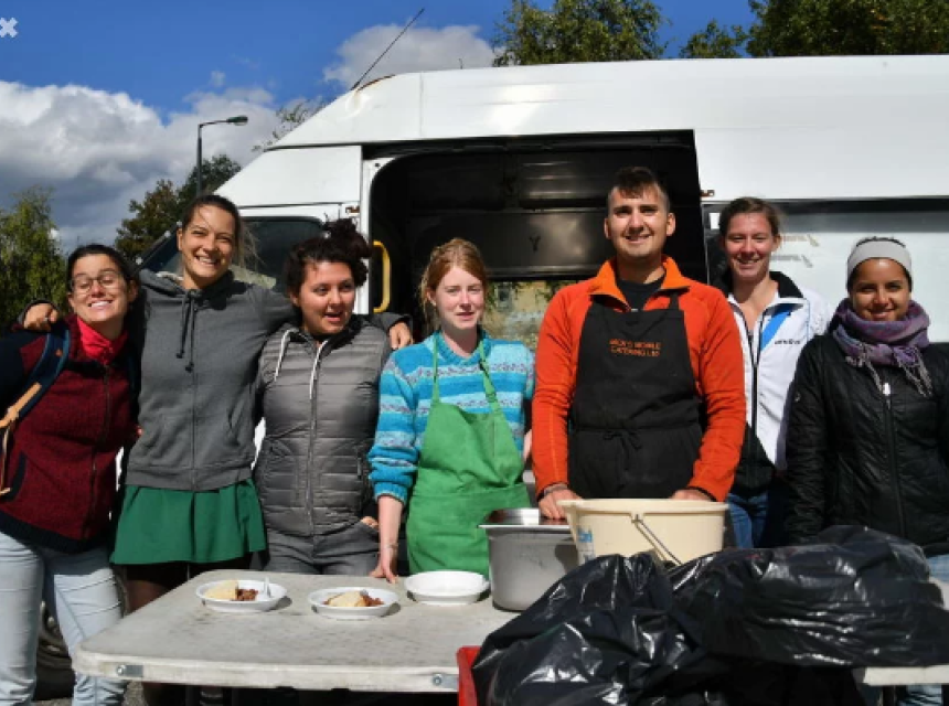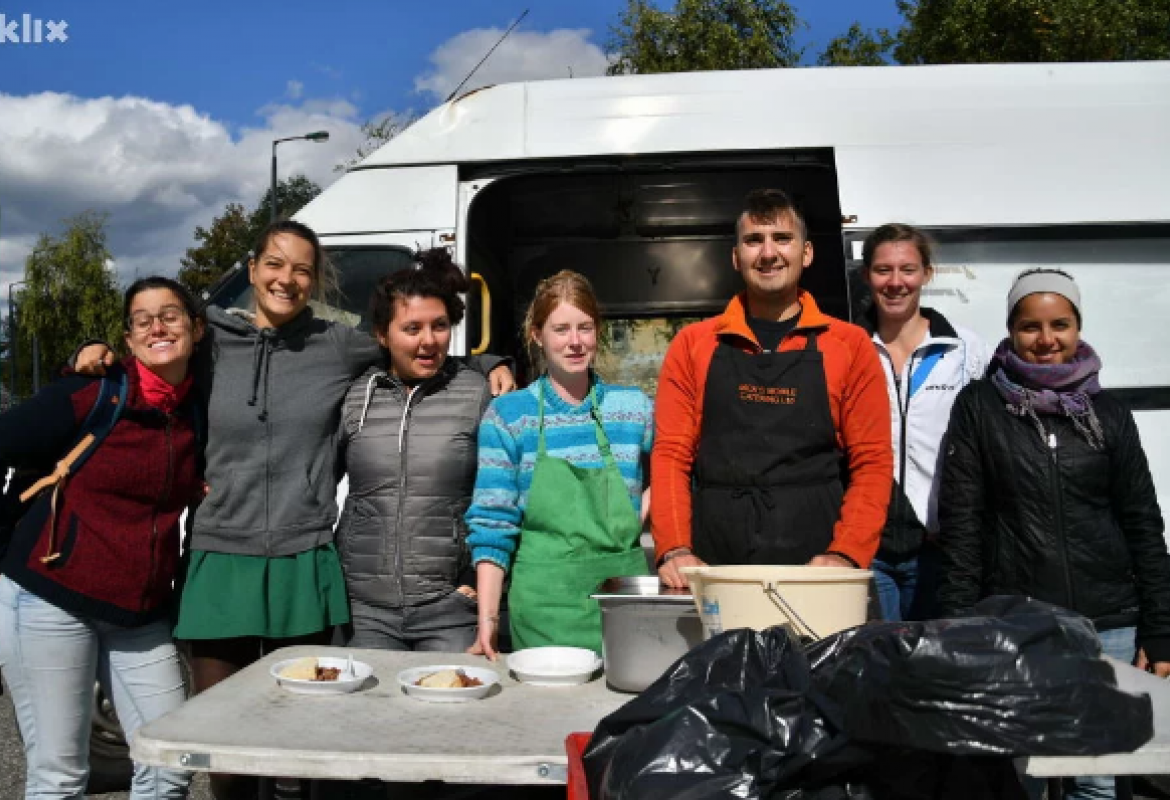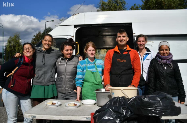 Volonteri dva puta dnevno dijele obroke migrantima na Željezničkoj stanici u Sarajevu. Njihov dan počinje vrlo rano jer trebaju pripremiti više desetina obroka, nakon čega se vraćaju u bazu, peru suđe i ponovo kuhaju obroke za večeru. Nije ih teško naći, jer ispred njihovog kombija vidite dugi red mladića migranata koji čekaju na jedan tanjih toplog obroka i šnitu hljeba.