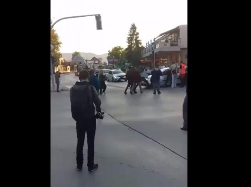 Na jednoj raskrsnici učesnici protesta zaustavili su automobil VW Golf V. Vozač je agresivno trubio i izazvao reakciju Davora Dragičevića.