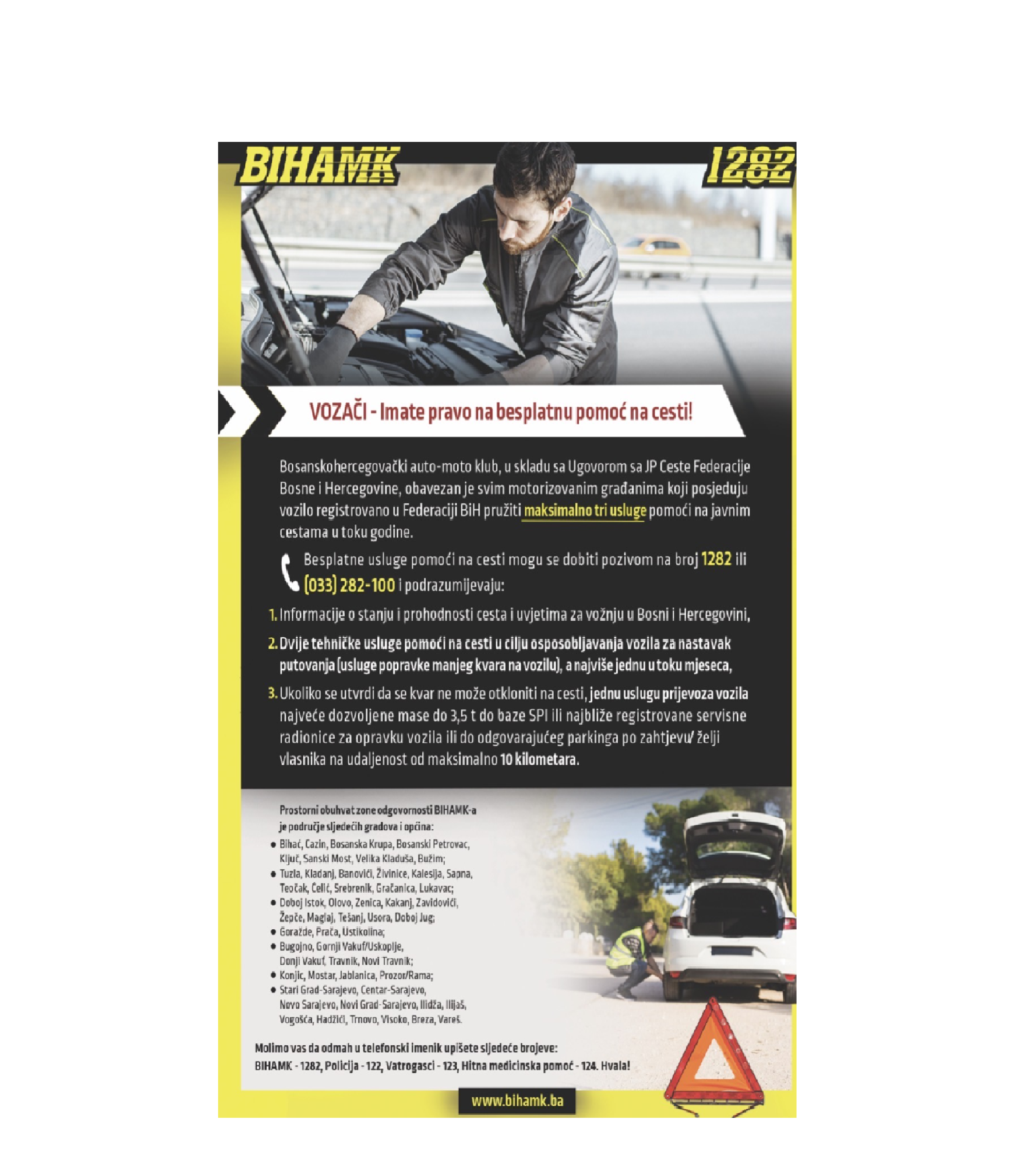 Besplatne usluge pomoći na cesti mogu se dobiti pozivom na broj 1282 ili (033) 282-100, i podrazumijevaju: