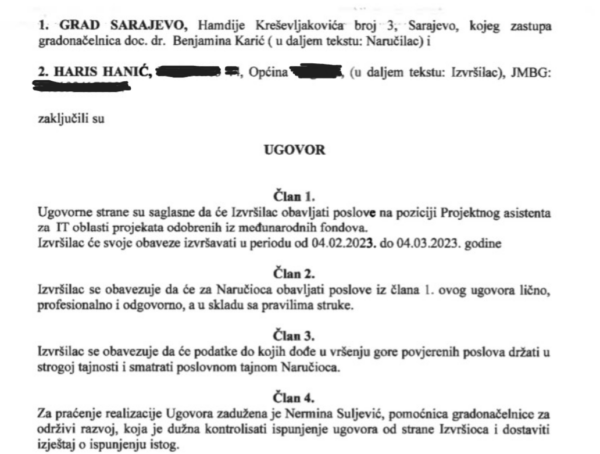 Inače, gradonačelnica Grada Sarajeva Benjamina Karić uporno odbija naš zahtjev za pristup informacijama koje se odnose na ugovore o djelu u Gradskoj upravi Grada Sarajeva pozivajući se na zaštitu podataka iako Agencija za zaštitu ličnih podataka BiH sugeriše da su podaci o ugovorima o djelu u javnom interesu jer je Gradska uprava Grada Sarajeva javni organ koji koristi budžet građana Grada Sarajeva i drugih građana sa napomenom da se zaštite lični podaci kao što su matični broj, broj računa i slični. Čak i ova agencija objavljuje vlastite ugovore o djelu na svom web portalu.