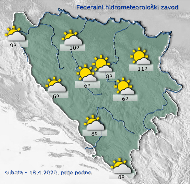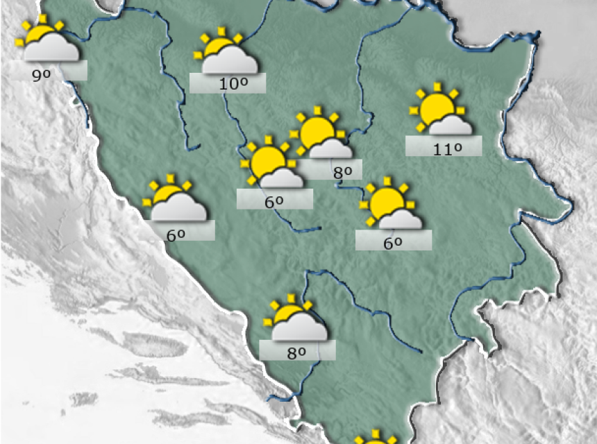 Danas u Bosni i Hercegovini sunčano uz malu do umjerenu oblačnost. Vjetar slab zapadnog i jugozapadnog smjera. Najniža jutarnja temperatura zraka većinom između 2 i 7°C, na jugu zemlje do 10°C. Najviša dnevna temperatura zraka uglavnom između 21 i 27°C.
