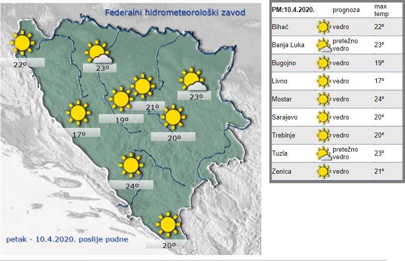 Danas u Bosni i Hercegovini većinom umjereno, prolazno može biti i pretežno oblačno vrijeme. Vjetar slab do umjerene jačine sjevernog i sjeveroistočnog smjera. Najniža jutarnja temperatura zraka većinom između 3 i 8°C, na jugu zemlje od 8 do 13°C. Najviša dnevna temperatura zraka uglavnom između 18 i 23°C, na jugu zemlje do 26°C.