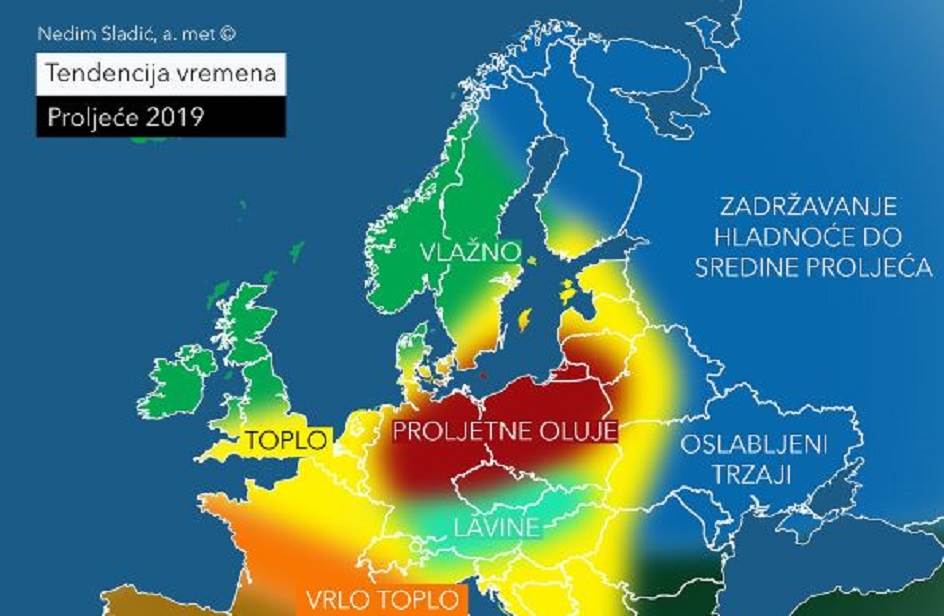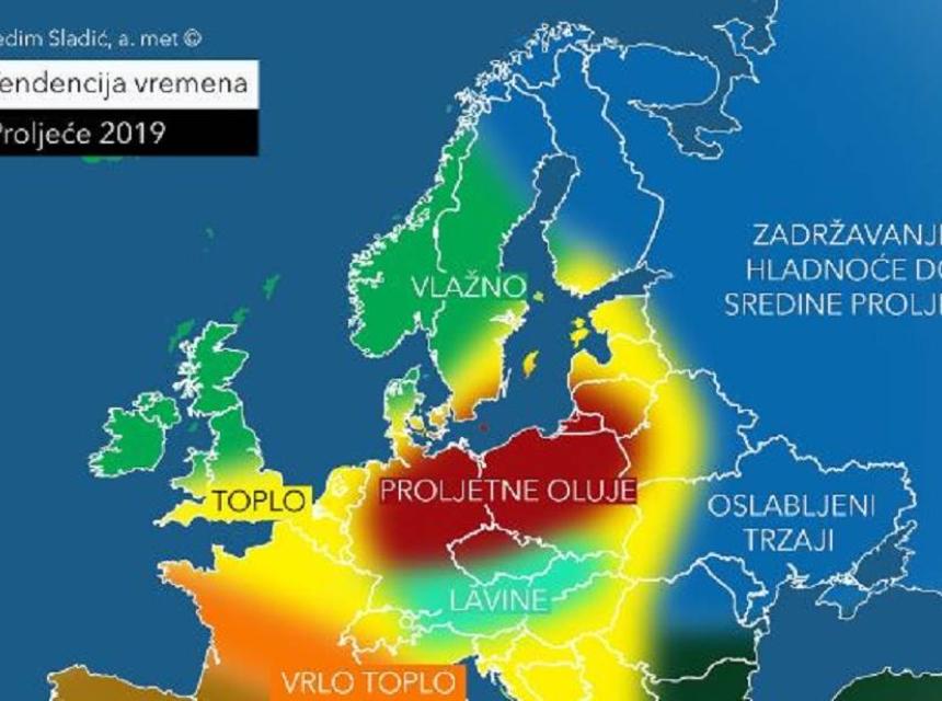 ''To stavlja određena područja, prvenstveno jugozapadne i dijelova centralne Europe pod rizik za dugotrajnije zadržavanje sušnijeg i stabilnijeg vremena pod utjecajem azorskog anticiklonalnog polja, pri čemu se priprema podloga za mogućnost jačeg razvoja toplinskih valova i ljetnih vrućina predstojećeg ljeta. Međutim, sama činjenica da bi se tlo zagrijavalo konvekcijom u dugotrajnijem trendu za posljedicu pri manjem prodoru svježine sa sjevera kolizija dvije zračne mase mogla bi određenim dijelovima centralne Europe prouzročiti dosta jake grmljavinske nepogode koje mogu nanijeti materijalnu štetu, naročito u drugom dijelu proljeća. Kada govorimo o alpskom području, snježni pokrivač koji je ove godine iznad prosjeka će uvjetovati prolongiranu zimsku sezonu, ali bi uslijed povišenijih temperatura u drugom dijelu proljeća mogao izazvati i stvaranje lavina, naročito od sredine proljeća. Također, naglo topljenje snijega može imati utjecaja na porast nivoa rijeka, prvenstveno Mure, Save i Dunava, te stoga postoji i određeni rizik od poplava, kako se prvi mjesec na području balkanskih zemalja prognozira kao nestabilniji, sa čestom dinamikom vremenskih prilika i nešto malo većom količinom padavina koje bi mogle pogoršati situaciju. Upravo to je razlog da područja južne Austrije, sjevera i istoka Hrvatske i Podunavlja u Srbiji budu pod većim oprezom. Ipak, generalno obuhvaćeno, Balkan očekuje toplije proljeće od prosjeka, naročito u njegovom drugom dijelu te uglavnom prosječna količina oborina, pri čemu se više oborina očekuje u prvoj polovini proljeća (mart), a manje u drugoj'',ispričao je Sladić za N1.