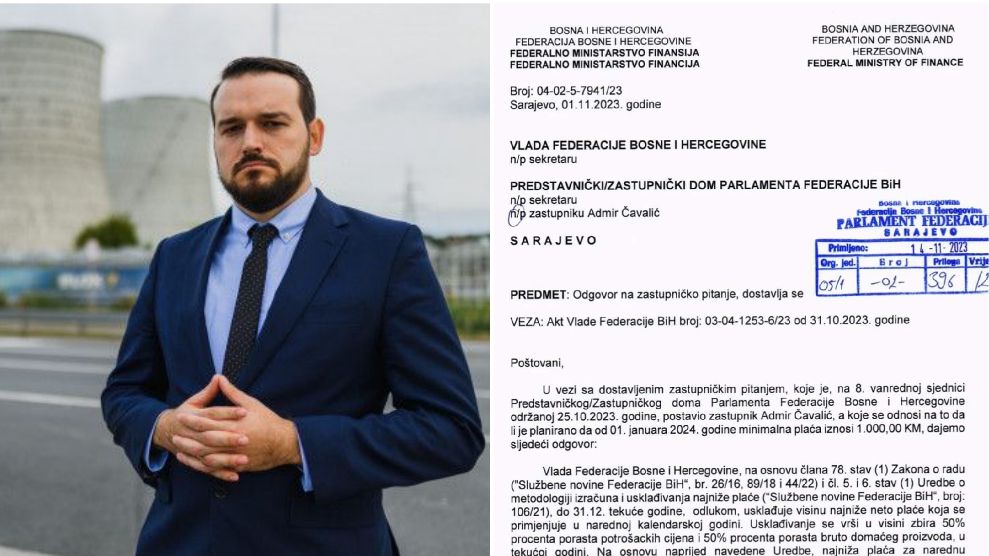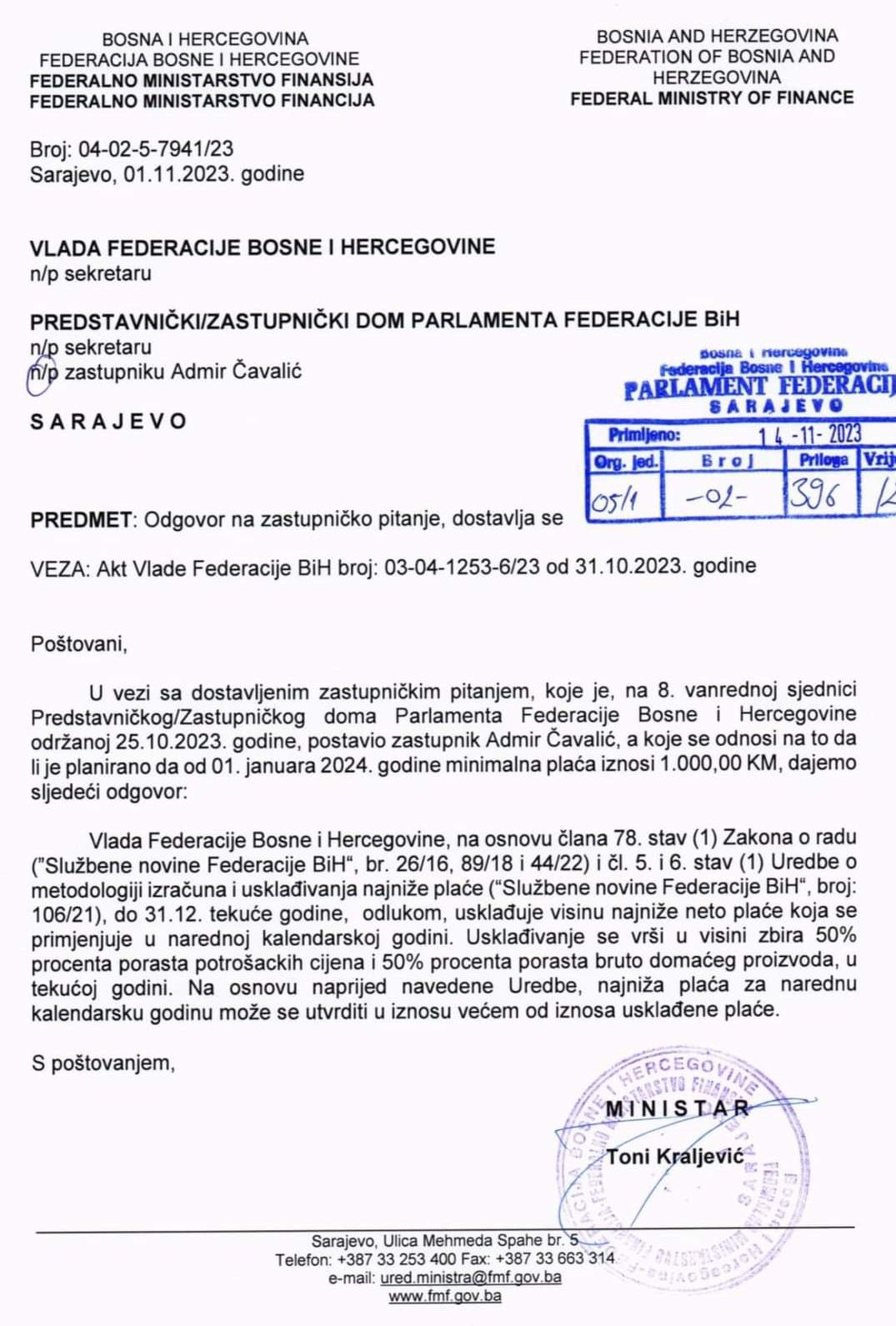 Zastupnik u Predstavničkom domu PFBiH Admir Čavalić još 25. oktobra resornom ministru postavio je jednostavno pitanje - da li je planirano da od 1. januara 2024. minimalna plaća iznosi 1.000 KM, ali se iz dopisa ministra Tonija Kraljevića još ne nazire konačan odgovor.