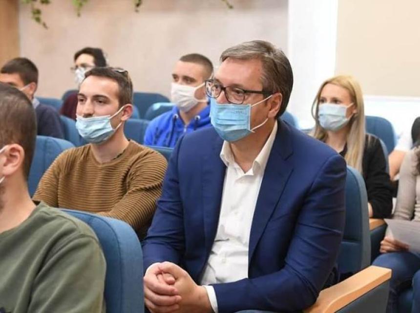 Na današnjem svečanom prijemu za brucoše srbijanski predsjednik je među kolegama studentima sjedio bez zaštitne maske, što se dalo vidjeti i na nekoliko fotografija objavljenim na portalima beogradskih medija.