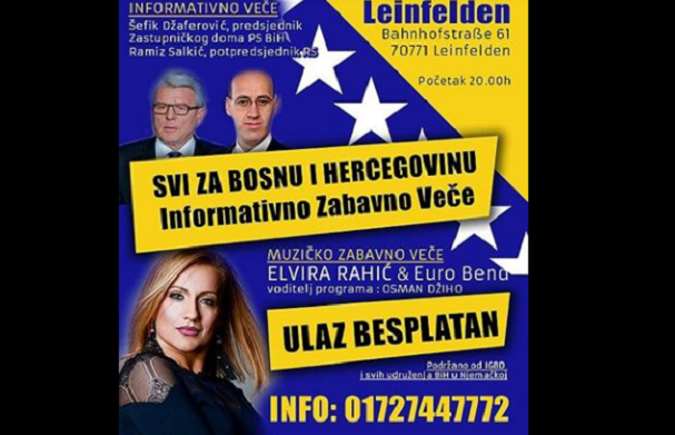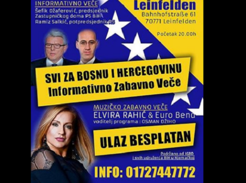 Šefik Džaferović i Ramiz Salkić, kandidati SDA za člana Predsjedništva BiH i predsjednika/potpredsjednika RS, prisustvovat će 8. septembra na informativno-zabavnoj večeri u njemačkom gradu Stuttgartu, gdje će nastupiti zajedno s folk pjevačicom Elvirom Rahić & Euro Bendom.