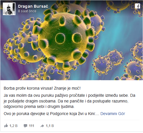 On je prenio poruku djevojke iz Podgorice koja živi u Kini, u kojoj navodi trenutno stanje u ovoj zemlji pogođenoj koronavirusom.