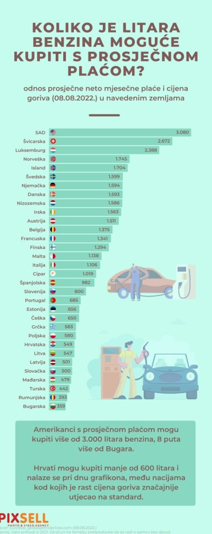 Infografika prikazuje koliko je litara benzina moguće kupiti s prosječnom plaćom prema Eurostat globepetrolprices.com. SAD, Švicarska i Luksemburg u samom su vrhu, dok su Turska, Rumunija i Bugarska na začelju.