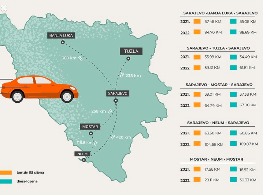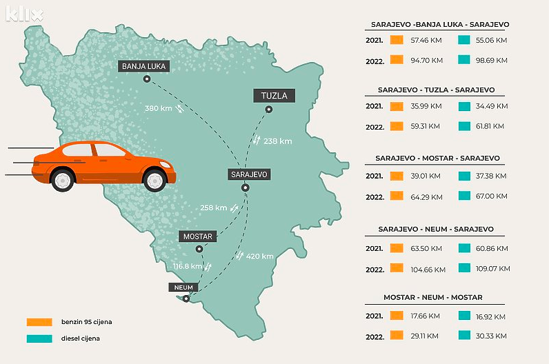 Ukoliko pretpostavimo da je prosječna potrošnja automobila na otvorenom oko 7 litara na 100 kilometara, prošle godine ste za putovanje od Sarajeva do Mostara i nazad morali izdvojiti od 37,38 do 39,01 KM u zavisnosti od toga da li je gorivo koje koristite benzin ili dizel.