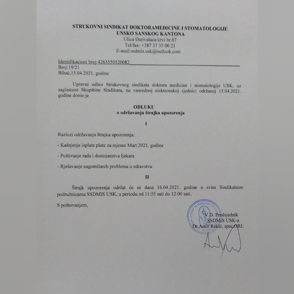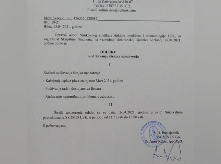 BIHAĆ, 15. aprila - Zbog nagomilanih problema u zdravstvu, nepoštivanja njihovog rada i kašnjenja martovske plate, Upravni odbor Strukovnog sindikata doktora medicine i stomatologije USK donio je odluku o održavanju štrajka upozorenja.