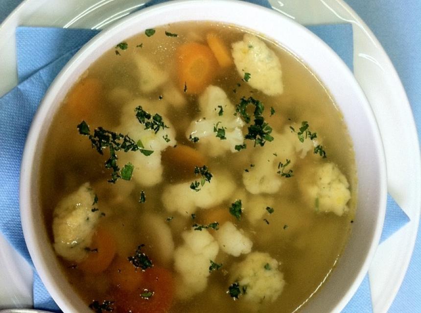 2. U ključalu supu stavljamo malom kašikom (koju smo predhodno namočili u supu da se smjesa ne bi ljepila) knedlice, dodamo zvjezdice i na male cvjetiće iskidanu cvjetaču