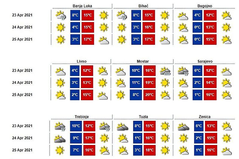 Prvog dana vikenda, sutra, u Bosni i Hercegovini će biti sunčano uz malu do umjerenu oblačnost. Vjetar slab do umjerene jačine istočnog i sjeveroistočnog smjera.
