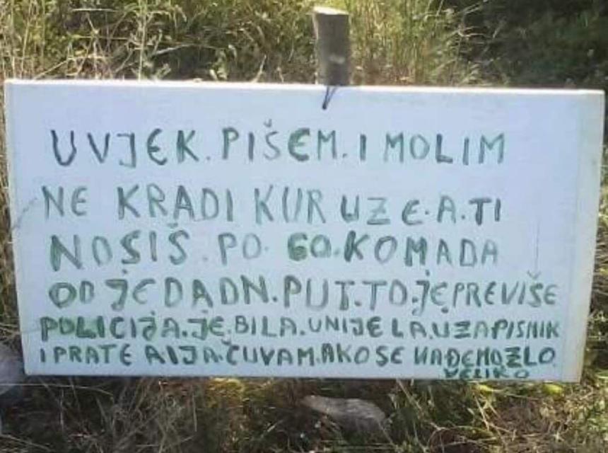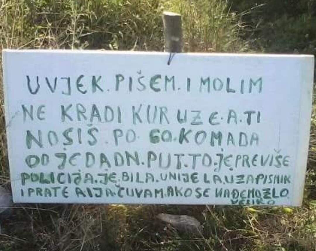 Zato im teško pada kada ih se vara i krade. Slikovito je to opisao jedan mještanin cazinskog naselja Vrelo, koji je na svojoj njivi, gdje uzgaja kukuruze ostavio zanimljivu poruku i upozorenje: