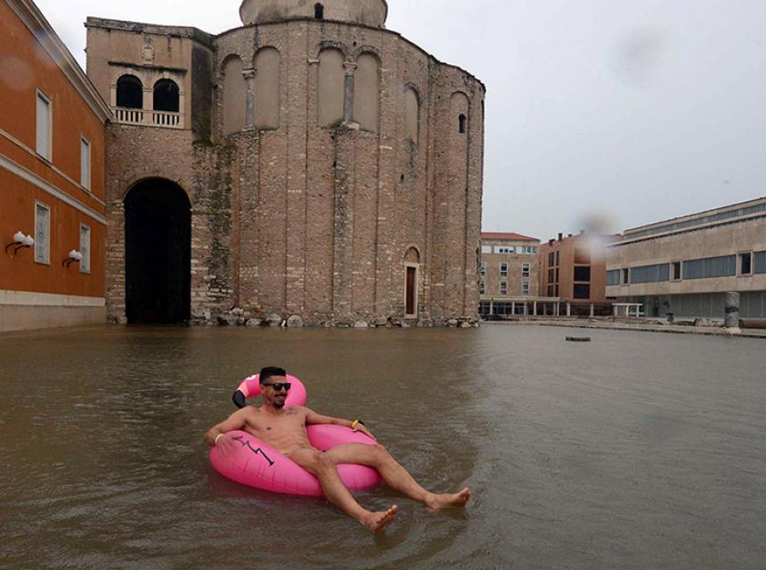 Zadar su juče zadesile nezapamćene poplave, poplavljen je Forum, ali se jedan Zadranin u svemu tome odlučio i za malo zabave. On je, naime, na gumenom flamingosu, "plivao" ulicama. I, čini se, da mu je to baš prijalo.