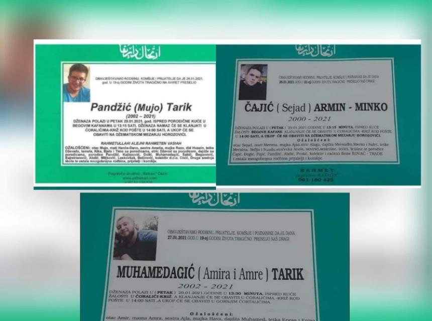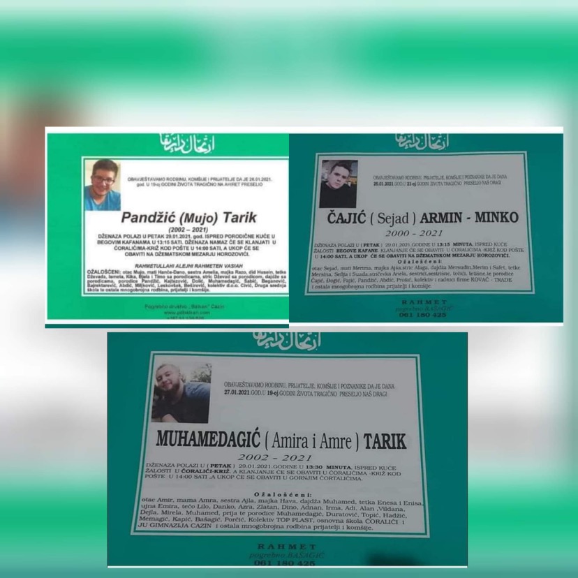 Zajedničko klanjanje dženaza trojici stradalih mladića iz Cazina biće u petak, u 14 sati, u Ćoralićima- Križ, kod Pošte.