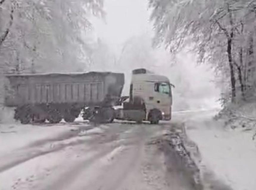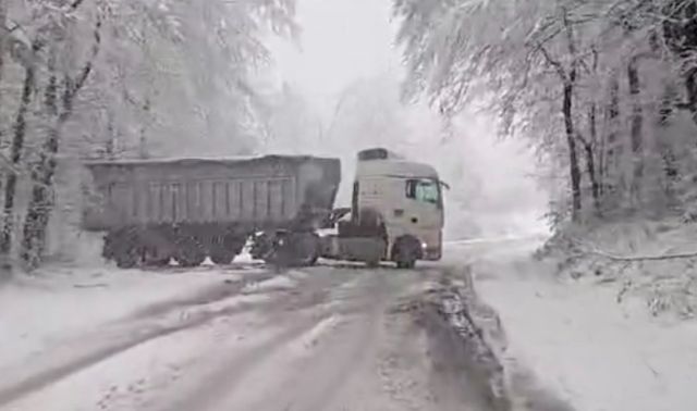 Na cesti kod Sanskog Mosta došlo je do opasne situacije kada je vozač kamiona, uslijed snježnih padavina, izgubio kontrolu nad vozilom i sletio s kolovoza.