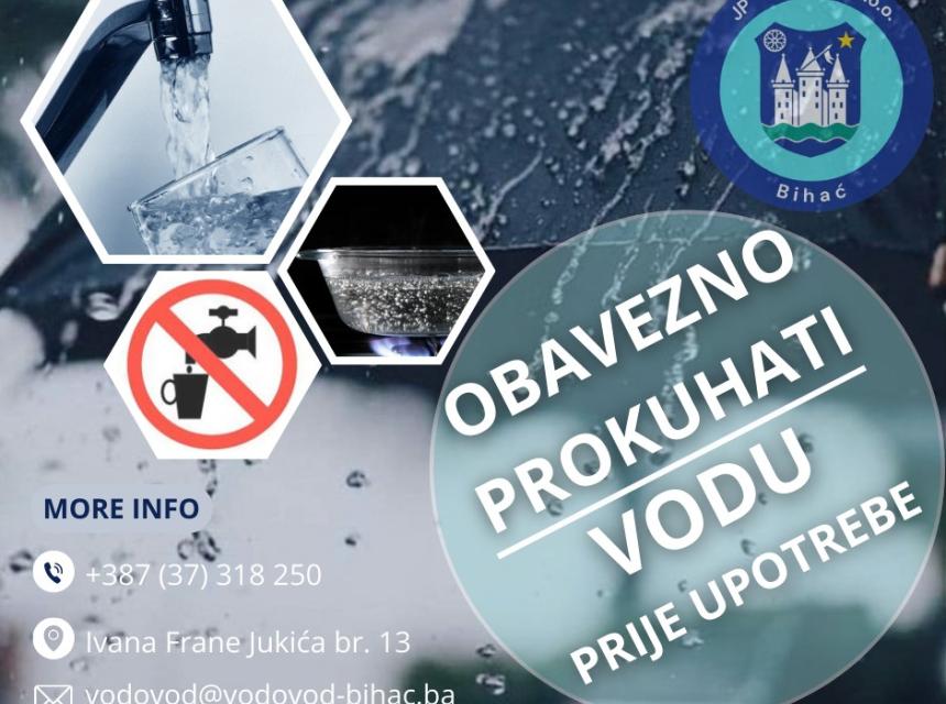 JP "Vodovod" d.o.o. Bihać obavještava sve korisnike u Gradskoj oblasti Bihaća da je došlo do povećane izdašnosti i zamućenja vode na svim izvorištima koja su u funkciji vodosnabdijevanja. Zbog trenutnih uvjeta, a radi zaštite zdravlja i sigurnosti, preporučuje se korisnicima da iz preventivnih razloga prokuhavaju vodu prije njezine upotrebe za piće.