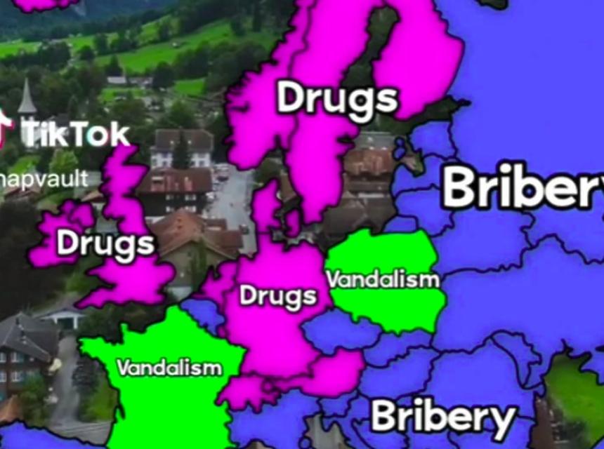 Naime, TikTok profil Map Vault objavio je mapu koja otkriva koja koja su to zločini najčešći u zemljama Evrope. Ova karta otkriva da su najčešća tri zločina u Evropi, a riječ je o drogi, vandalizmu i podmićivanju.