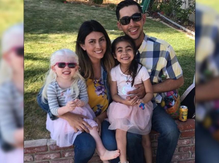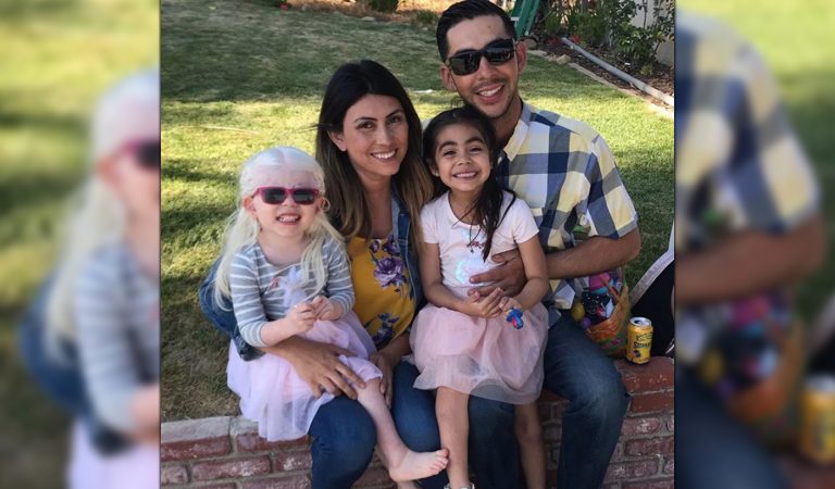 Iako su joj roditelji tamnije puti s crnom kosom i tamnosmeđim očima, djevojčica ima gotovo bijelu kosu, svijetle je puti i plavih očiju.