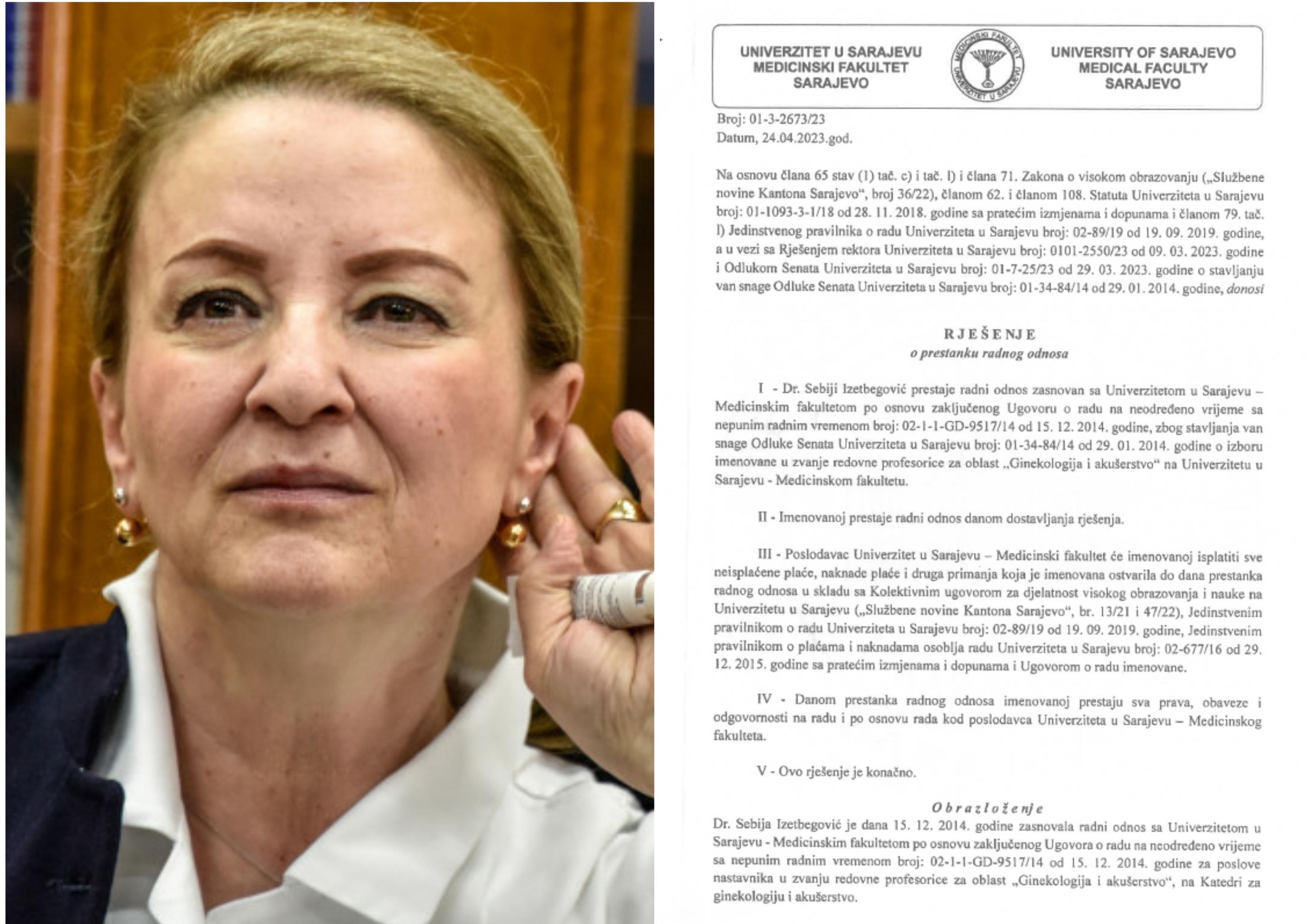 - Dr. Sebiji Izetbegović prestaje radni odnos s Medicinskim fakultetom Univerziteta u Sarajevu na osnovu zaključenog Ugovor o radu na neodređeno vrijeme s nepunim radnim vremenom od 15. 12. 2014. godine, zbog stavljanja van snage odluke Senata Univerziteta u Sarajevu od 29.1.2022. godine o izboru imenovane u zvanje redovne profesorice za oblast Ginekologija i akušerstvo na Medicinskom fakultetu Univerziteta u Sarajevu - navodi se u rješenju od 24. aprila.