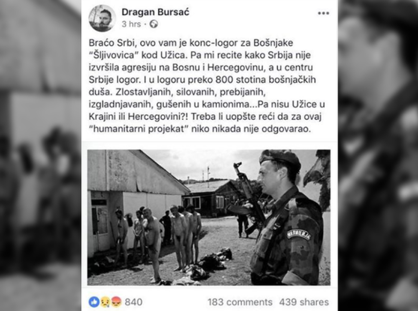 U statusu postavljenom na društvenoj mreži, Bursać se obratio riječima: "Braćo Srbi ovo vam je konc - logor