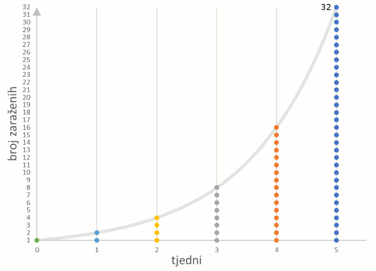U slučaju epidemije Covida-19 u idealnim uvjetima očekivalo bi se da se eksponencijalno širi - da jedna osoba zarazi oko dvije, dvije zaraze četiri, četiri zaraze 16 itd. (grafikon GORE). Međutim, u realnom svijetu to nije tako. Virus nije stalno okružen istim uvjetima za širenje. Njegov rezervoar za širenje se smanjuje, a on postaje sve izoliraniji ljudima sa stečenim imunitetom.