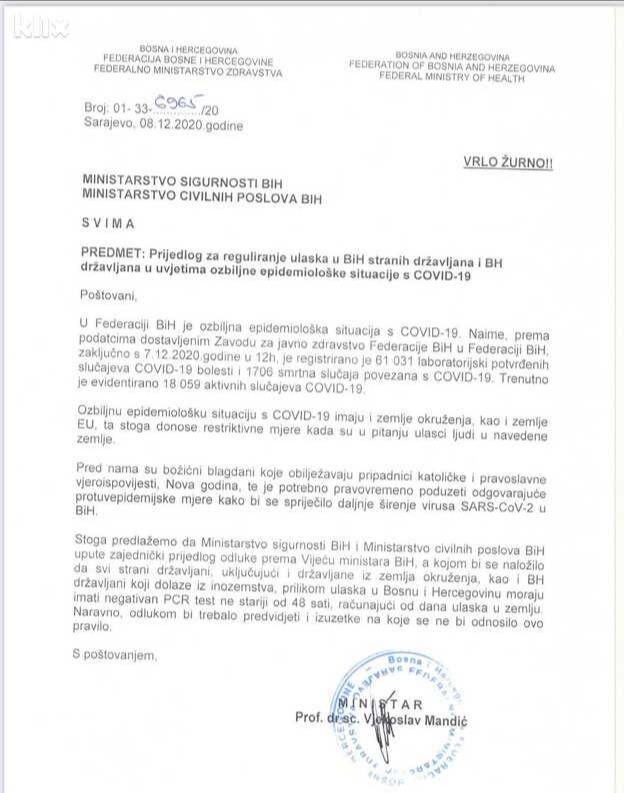 "Ozbiljnu epidemiološku situaciju imaju i zemlje okruženja kao i zemlje EU, pa stoga donose restriktivne mjere kada su u pitanju ulascu ljudi u navedene države. Pred nama su božićni blagdani koji obilježavaju pripadnici katoličke i pravoslavne vjeroispovijesti, zatim i Nova godina pa je potrebno pravovremeno poduzeti protuepidemijske mjere da vi se spriječilo daljnje širenje virusa", naveli su iz Federalnog ministarstva zdravstva.