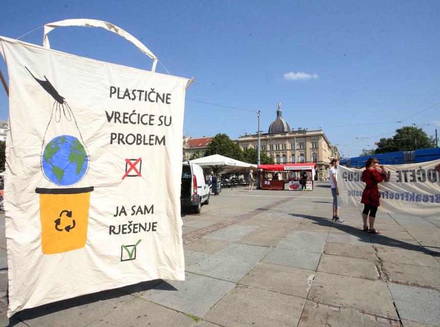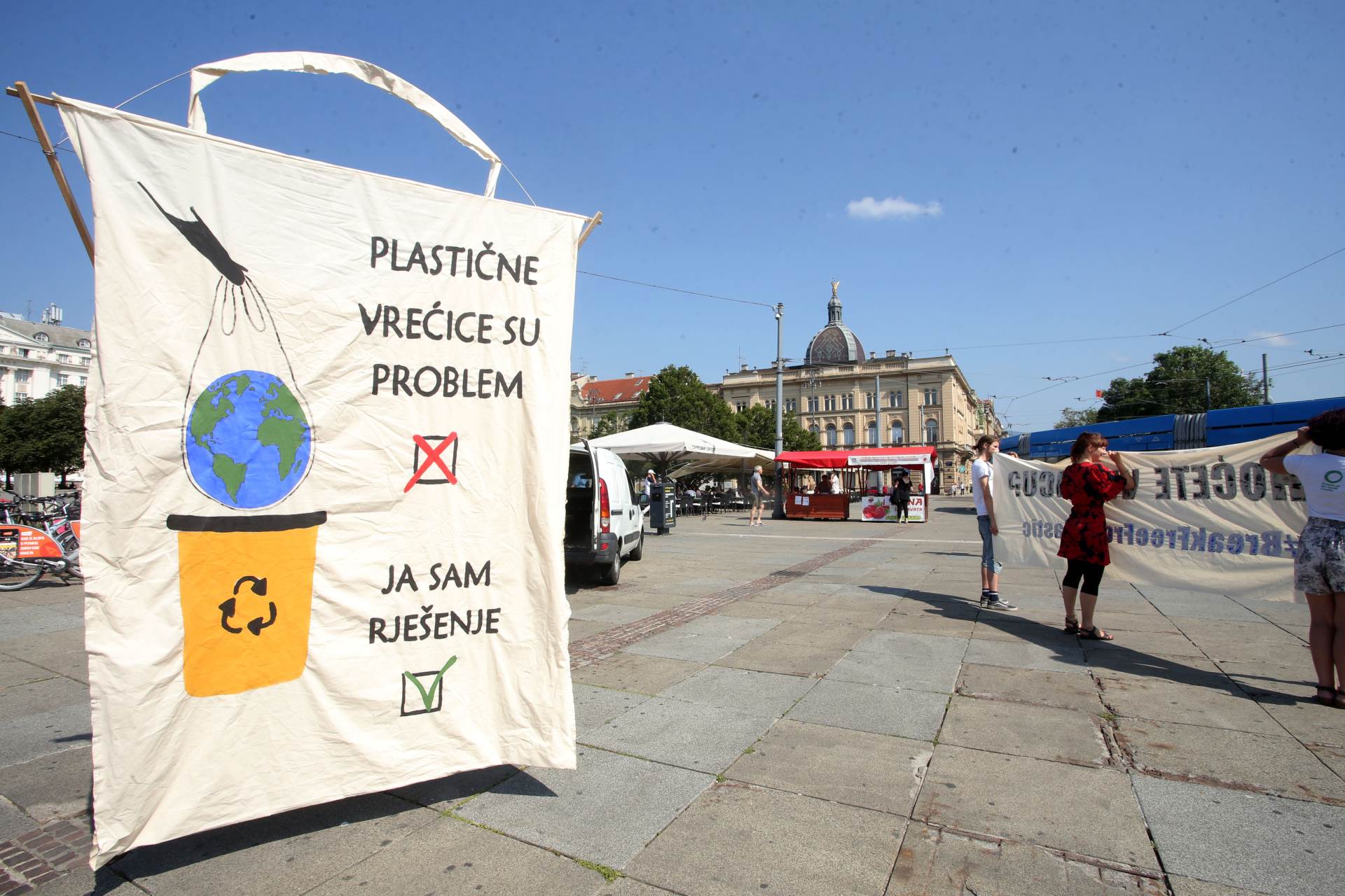 Aktivisti Zelene akcije na Glavnom kolodvoru u Zagrebu su istaknuli transparent "Croatia: Full of plastic" (Hrvatska: Puna plastike), zatim natpis "Plastične vrećice su problem. Ja sam rješenje", a s natpisom "Hoćete vrećicu?" aktivisti će tijekom ovog tjedna hodati Zagrebom i građanima dijeliti platnene vrećice.
