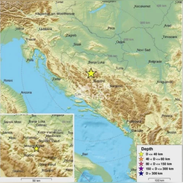 Epicentar zemljotresa, prema EMSC, bio je 21 kilometar istočno od Mrkonjić-Grada