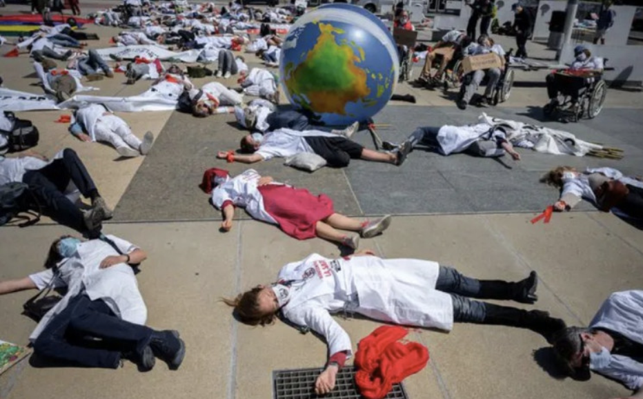 Odjeveni u bijele liječničke kute, aktivisti pokreta "Doctors for Extinction Rebellion" krenuli su pješice od ženevskoga Trga nacija prema sjedištu WHO-a, gdje su ih dočekali generalni direktor Tedros Adhanom Gebrejesus (Ghebreysus) i Maria Neira, direktorica za zaštitu okoliša, klimatske promjene i zdravlje.