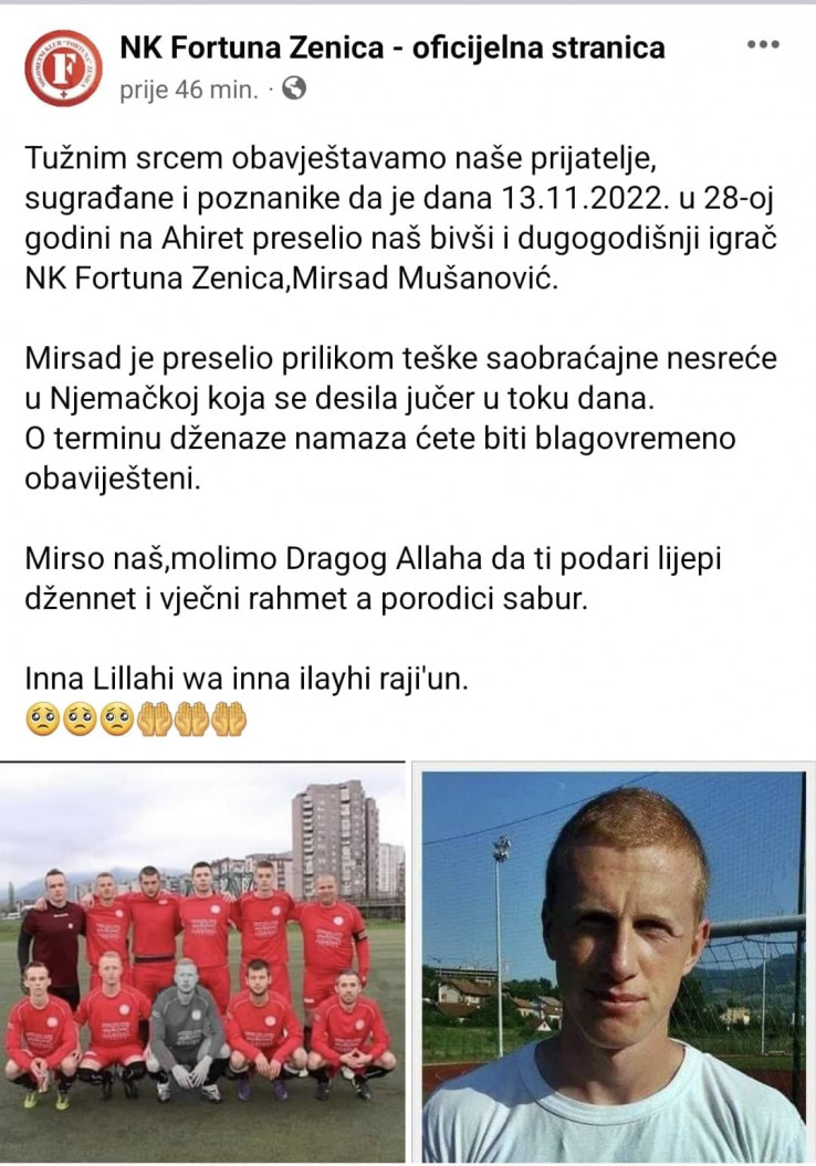 - Tužnim srcem obavještavamo naše prijatelje, sugrađane i poznanike da je u 28. godini na Ahiret preselio naš bivši i dugogodišnji igrač NK Fortuna Zenica Mirsad Mušanović. Mirsad je preselio prilikom teške saobraćajne nesreće u Njemačkoj koja se desila jučer u toku dana - stoji, između ostalog, u objavi.