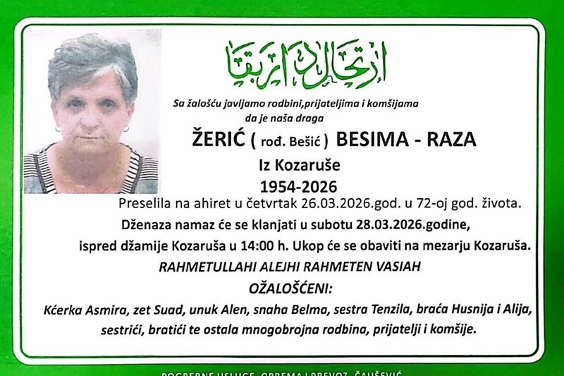 Dženaza-namaz će se klanjati u subotu 28.03.2026. godine ispred džamije Kozaruša u 14:00 sati.